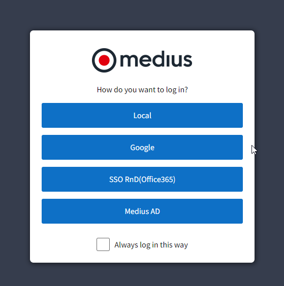 On the login screen, select the Medius.Security option and enter the username and password as usual.