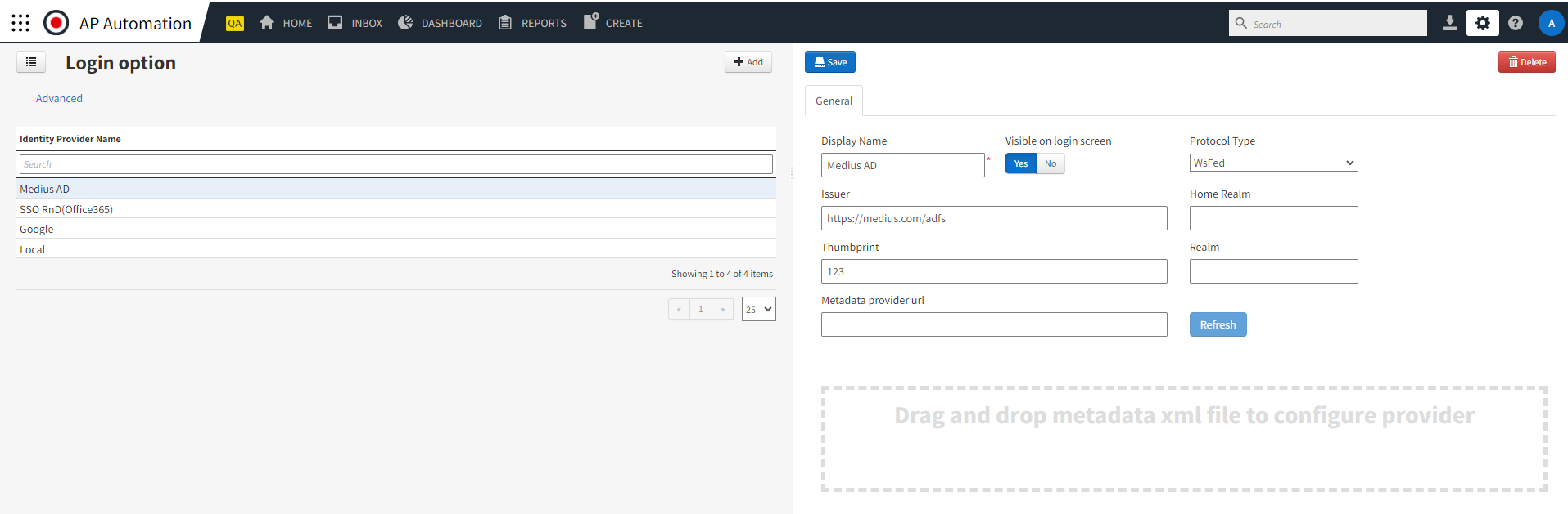 https://test.medius-group.com/adfs/ls/, modify it to the followinghttps://test.medius-group.com/FederationMetadata/2007-06/FederationMetadata.xmlto download the XML file.When the XML file has been downloaded, drag and drop it onto the highlighted area in the application. Make sure that the thumbprint field value is changed when the file is uploaded.