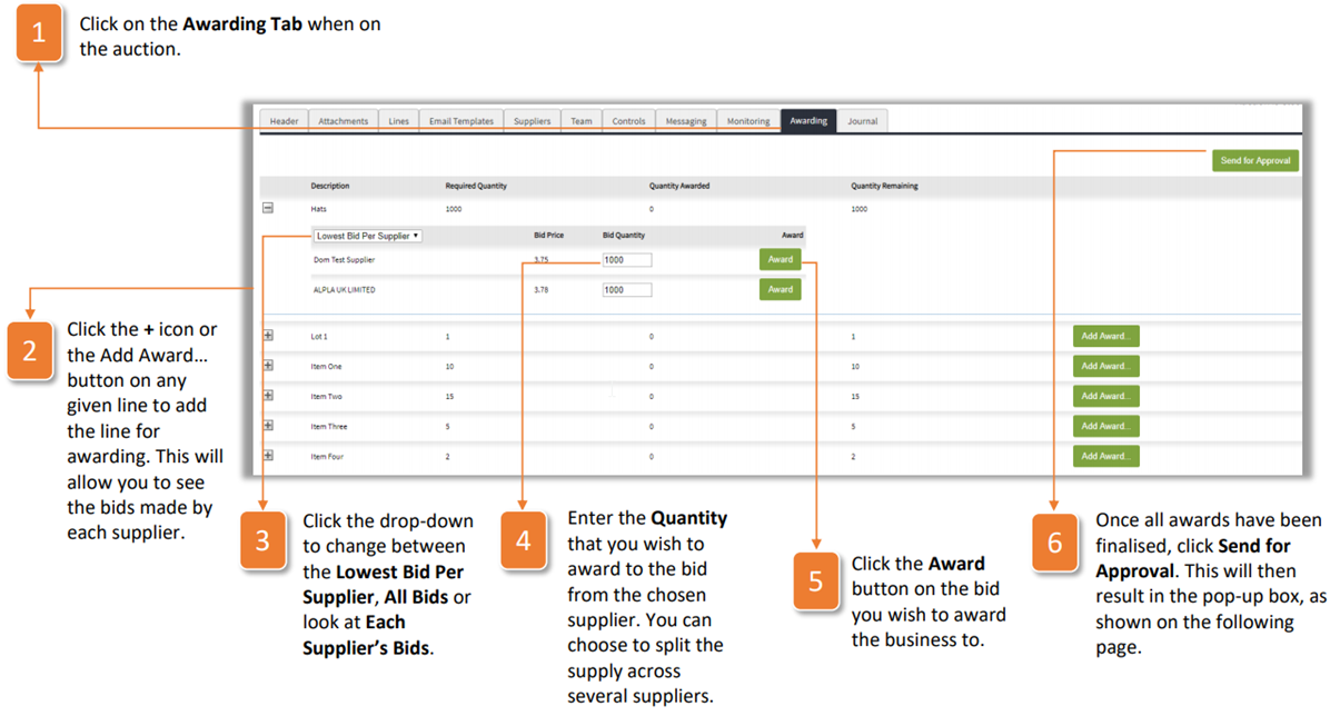 Once the auction has closed, you will then have the ability to award the business to one of the competing suppliers. To do this, follow the instructions below: