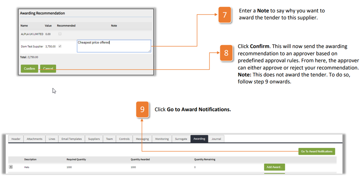 8. Click Confirm. This will now send the awarding recommendation to an approver based on predefined approval rules. From here, the approver can either approve or reject your recommendation. Note: This does not award the tender. To do so, follow step 9 onwards.