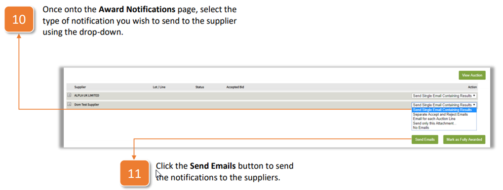 11. Click the Send Emails button to send the notifications to the suppliers