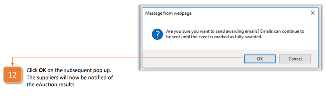12. Click OK on the subsequent pop up. The suppliers will now be notified of the eAuction results.