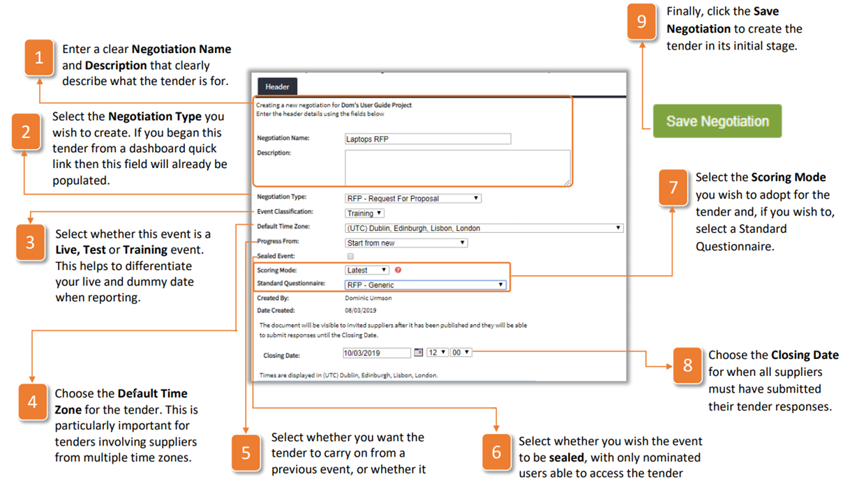 1. Enter a clear Negotiation Name and Description that clearly describe what the tender is for.