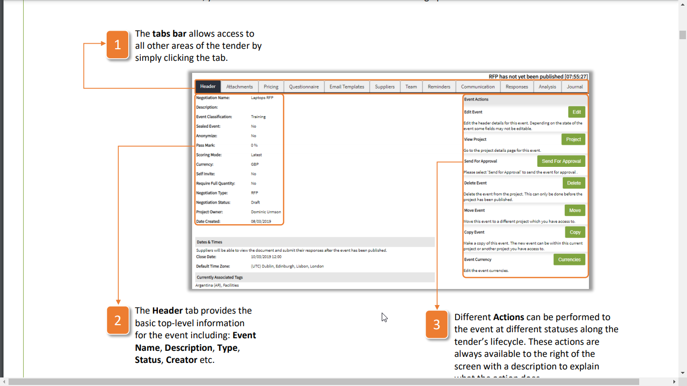 3. Different Actions can be performed to the event at different statuses along the tender's lifecycle. These actions are always available to the right of the screen with a description to explain what the action does.