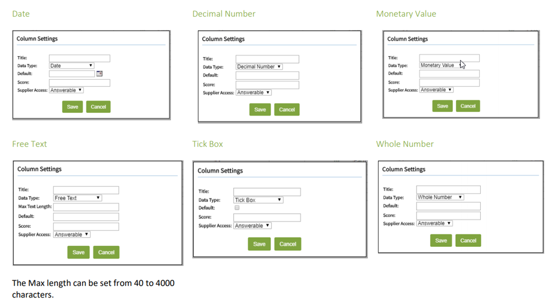 The following are the views you will see when selecting the different Data Types when creating a new column:
