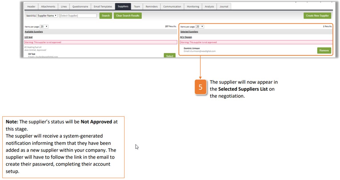 5. The supplier will now appear in the Selected Suppliers List on the negotiation.