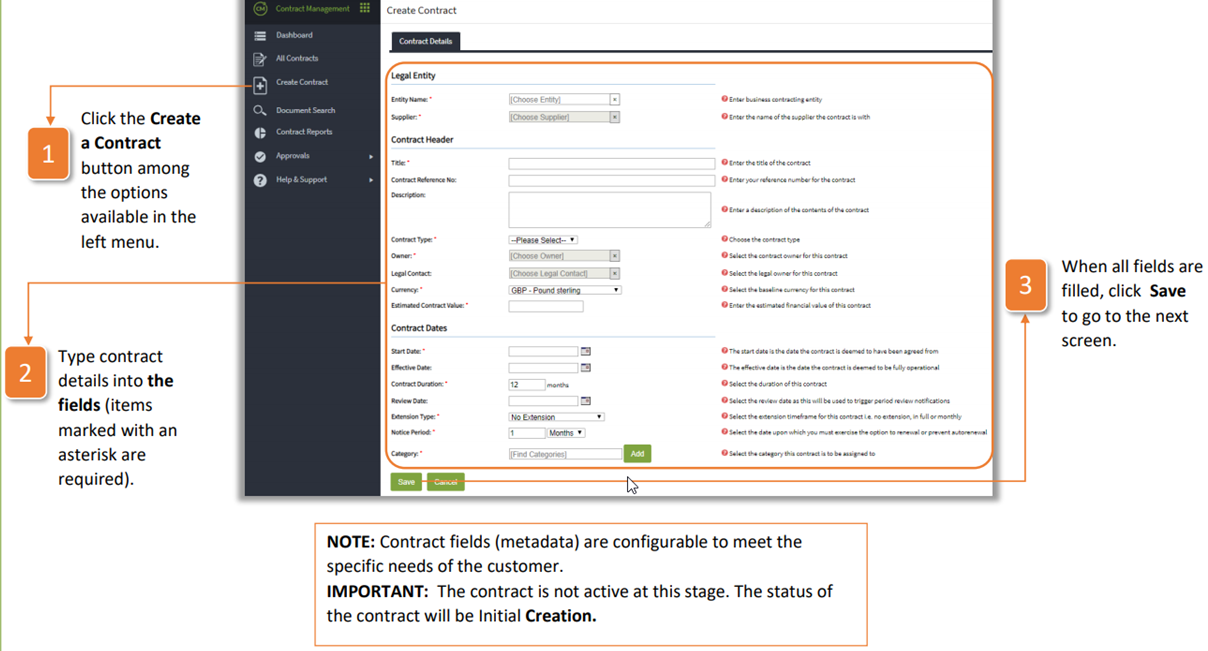 | NOTE: Contract fields (metadata) are configurable to meet the specific needs of the customer. IMPORTANT: The contract is not active at this stage. The status of the contract will be Initial Creation. |