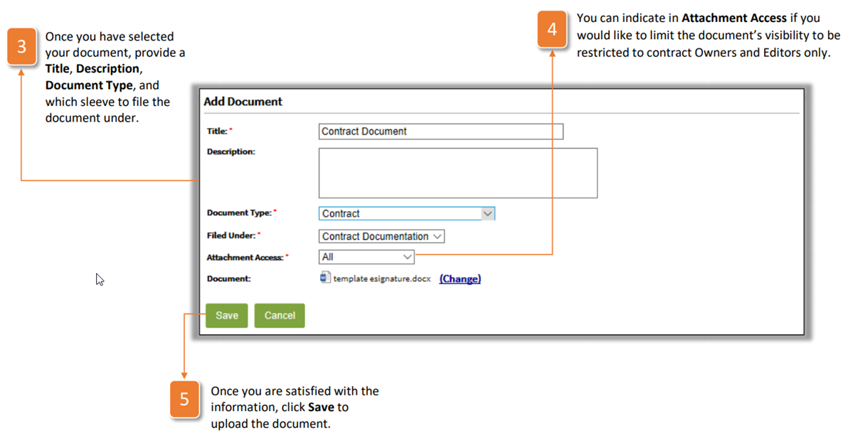 - You can indicate in Attachment Access if you would like to limit the document's visibility to be restricted to contract Owners and Editors only.